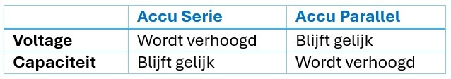 Samengevat:• Parallel = meer looptijd, zelfde spanning • Serie = hogere spanning, zelfde looptijd Kies dus op basis van wat je systeem nodig heeft qua spanning én hoe lang je stroom wilt gebruiken. |
