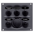 Het paneel beschikt over vijf schakelaars met een maximale stroom van 20 ampère en een geïntegreerd 12V stopcontact. Hierdoor kunnen verschillende elektrische apparaten eenvoudig worden aangesloten en bediend vanuit één centraal paneel.